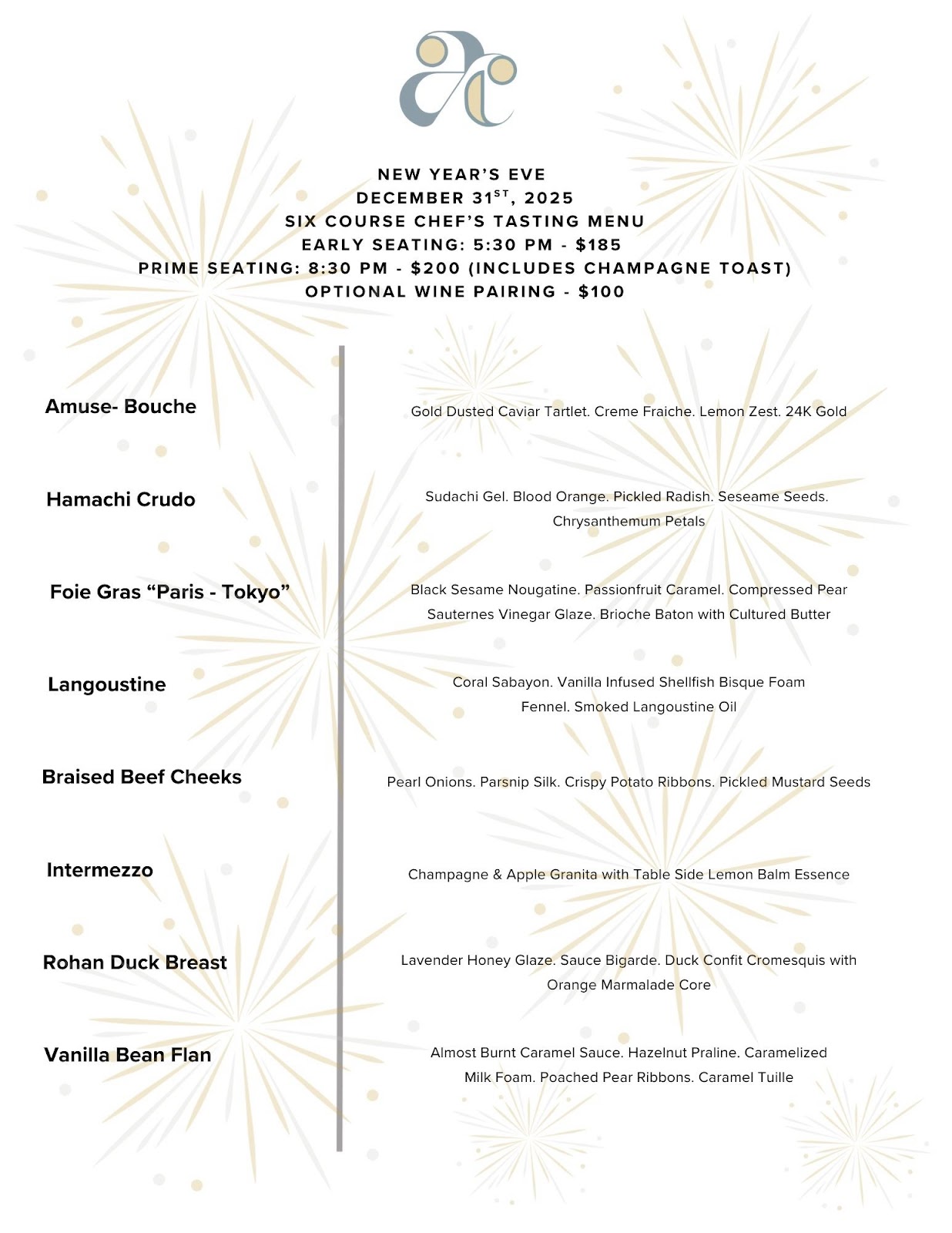 Oysters & Fresh SeafoodDessertsCatering MenuA La CarteChef's 6 Course Tasting MenuNew Years Eve menu
